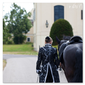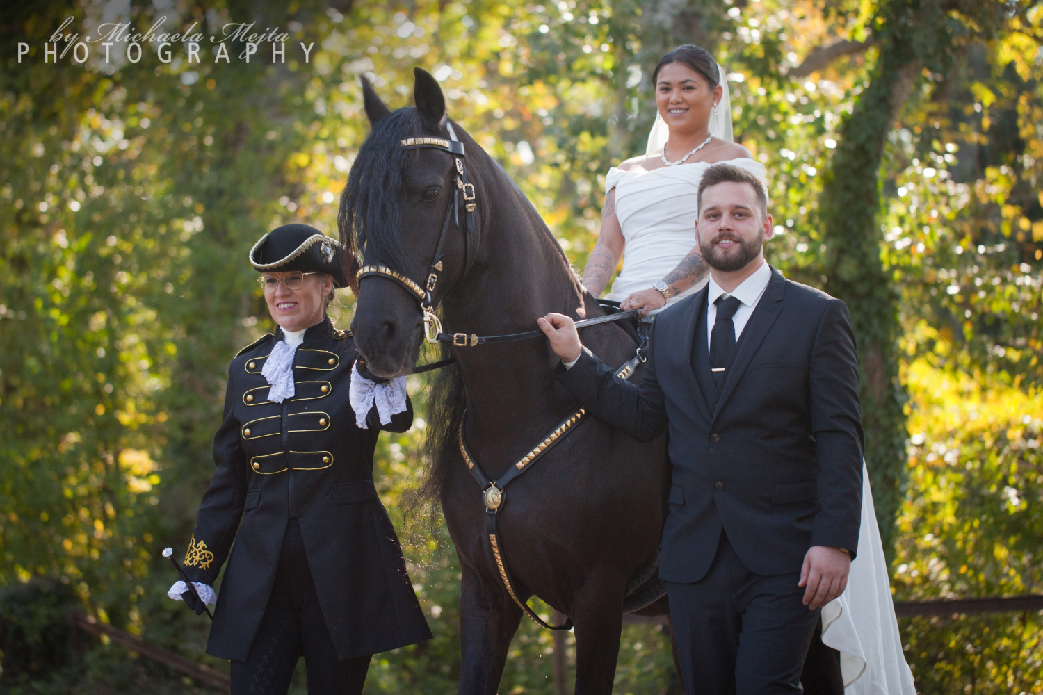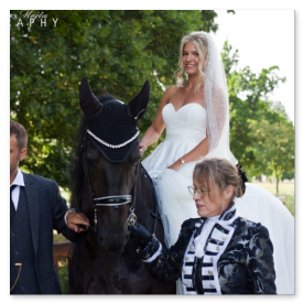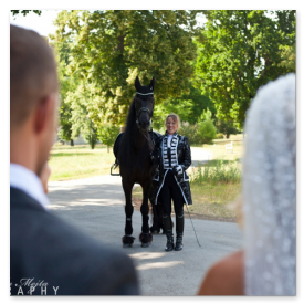 ♥ Outfit: Verschiedene Outfits sind möglich, Sie entscheiden. Passend zum Pferd und abgestimmt auf den Look Ihrer Hochzeit stehen Outfits in Gold, Silber, Barock oder Tracht zur Verfügung. Auch Marino wird passend gestylt - Mähne offen oder geflochten, Lederzeug in verschiedenen Ausführungen uvm.